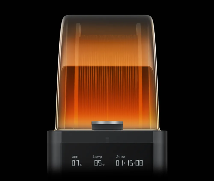 Under tørreprocessen roterer filamentspolerne automatisk for at sikre en mere jævn tørring.