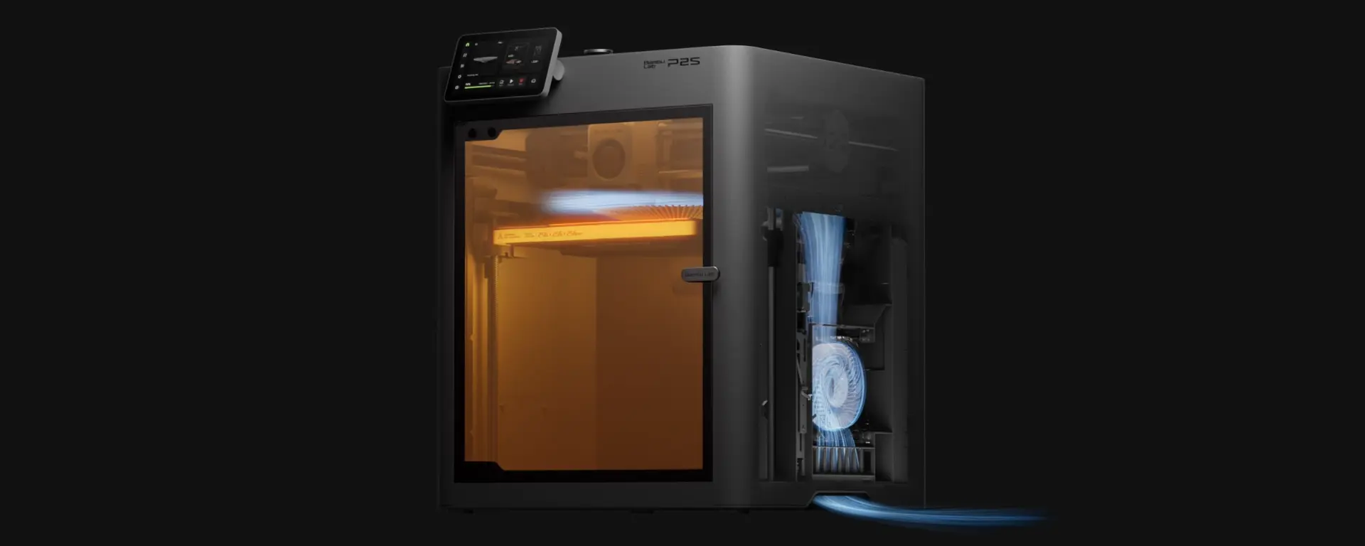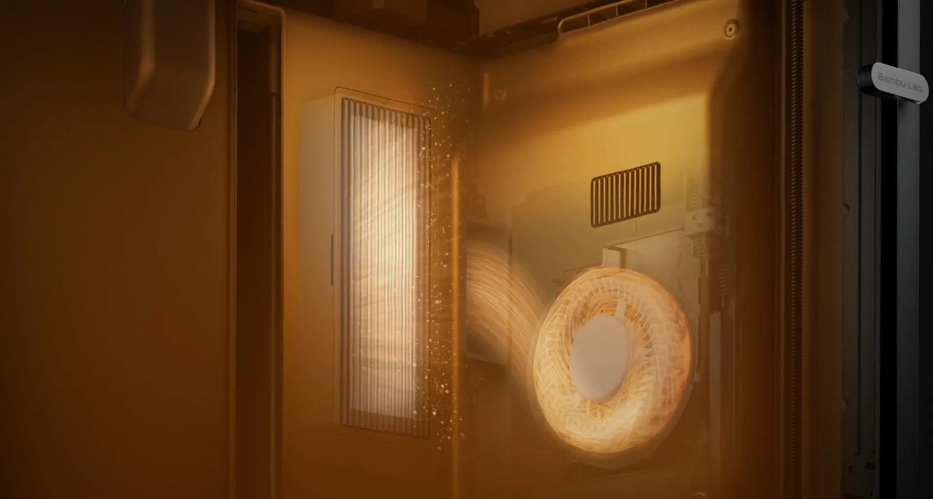 Forskellen fra traditionelle kølesystemer, der recirkulerer varm luft, trækker P2S's Adaptive Airflow System kølig luft direkte ind fra uden for kammeret. Dette forbedrer køleeffektiviteten betydeligt, så du trygt kan printe lavtemperaturfilamenter med døren lukket—uden at bekymre dig om kvaliteten af overhæng eller tilstopninger i dysen.
